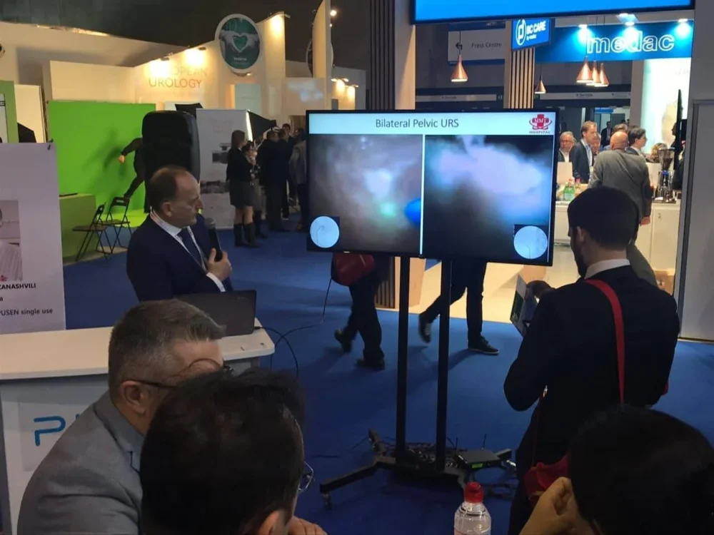 В настоящее время, по просьбе одного из главных спонсоров конгресса, который производит малоинвазивное оборудование для дробления камней, профессор Гурам Каразанашвили, как международный эксперт, представил европейским урологам современные технологии для дробления камней почки и мочеточника, произведённые ведущей китайской компанией, такие как одноразовые цифровые уретерореноскопы и лазер.
