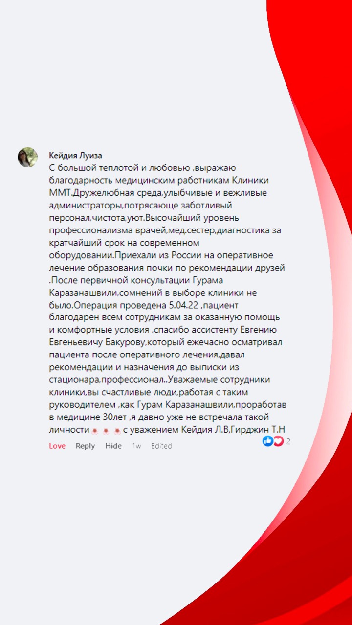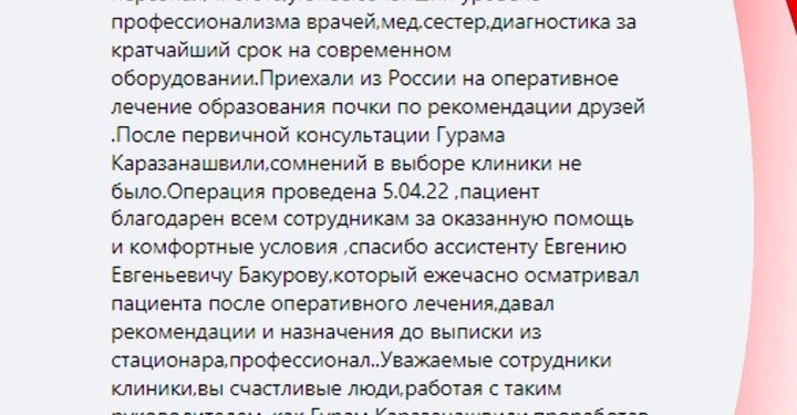 С большой теплотой и любовью ,выражаю благодарность медицинским работникам Клиники Роботизированного центра Каразанашвили. Дружелюбная среда, улыбчивые и вежливые администраторы, потрясающе заботливый персонал, чистота, уют. Высочайший уровень профессионализма врачей, мед. сестер, диагностика за кратчайший срок на современном оборудовании.Приехали из России на оперативное лечение образования почки по рекомендации друзей .После первичной консультации Гурама Каразанашвили, сомнений в выборе клиники не было.Операция проведена 5.04.22 ,пациент благодарен всем сотрудникам за оказанную помощь и комфортные условия ,спасибо ассистенту Евгению Евгеньевичу Бакурову, который ежечасно осматривал пациента после оперативного лечения, давал рекомендации и назначения до выписки из стационара, профессионал..Уважаемые сотрудники клиники, вы счастливые люди, работая с таким руководителем ,как Гурам Каразанашвили, проработав в медицине 30лет, я давно уже не встречала такой личности![]()